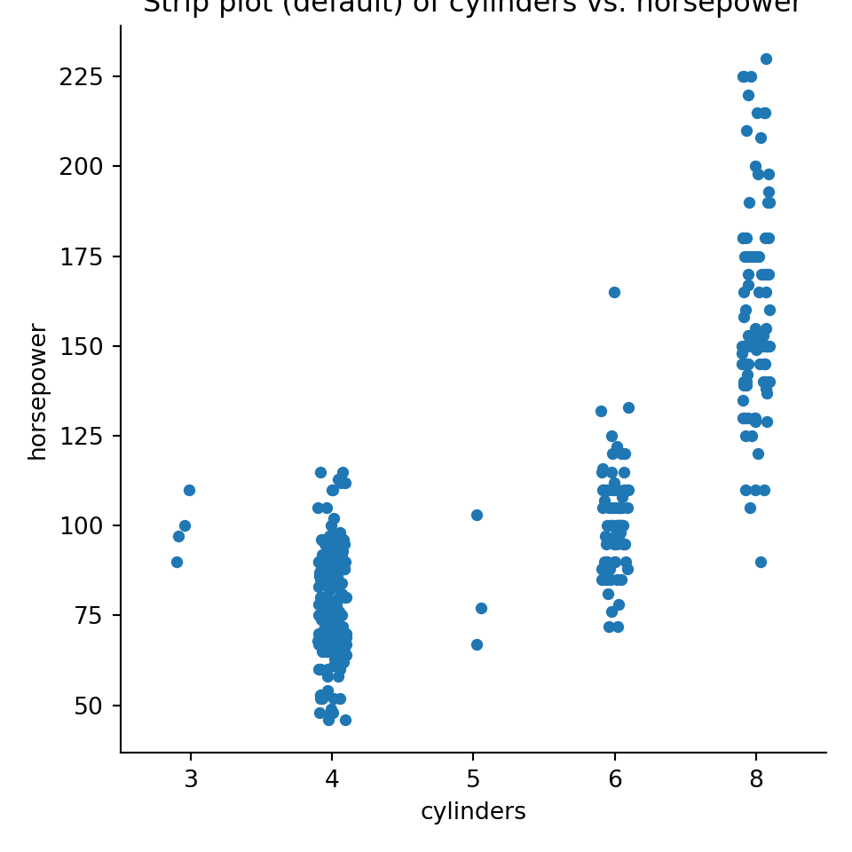 pyplot.figure(figsize=(4,6));seaborn.catplot(x="cylinders",y="horsepower",data=mpg);pyplot.title("Strip plot (default) of cylinders vs. horsepower");pyplot.show()