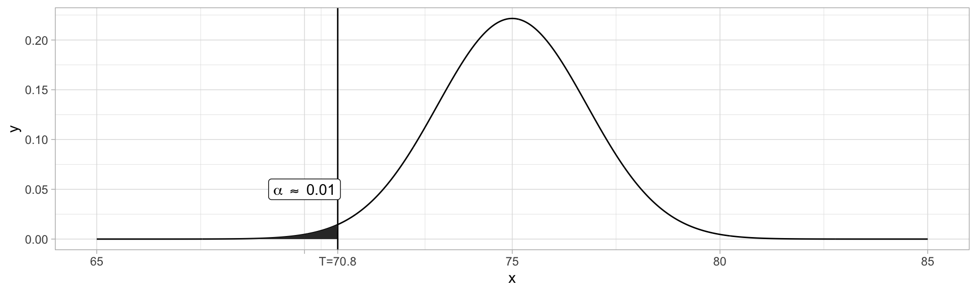 annotate("label", x=70, y=0.05, label=TeX(paste("\\alpha \\approx", round(pnorm(x.0, mean=x.true, sd=9/sqrt(25)), 3)))) +