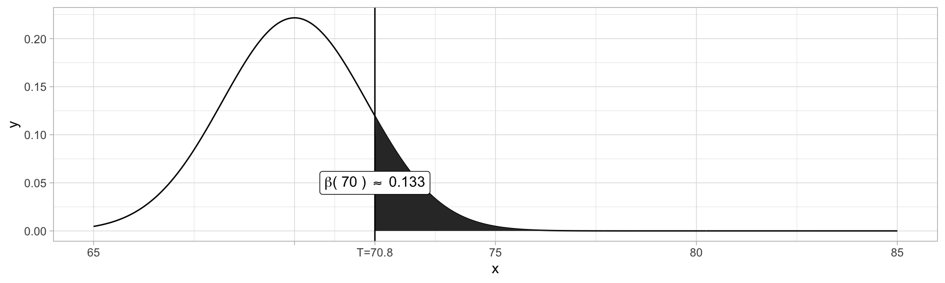 annotate("label", x=72, y=0.05, label=TeX(paste("\\beta(", x.true,") \\approx", round(1-pnorm(x.0, mean=x.true, sd=9/sqrt(25)), 3)))) +
