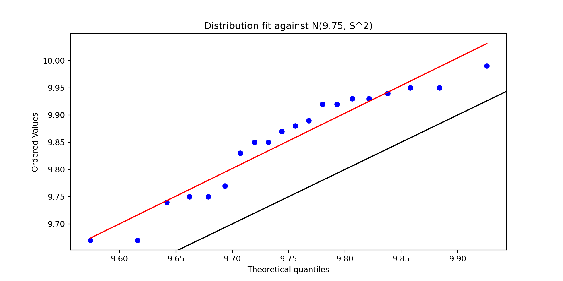 p = pyplot.title("Distribution fit against N(9.75, S^2)")